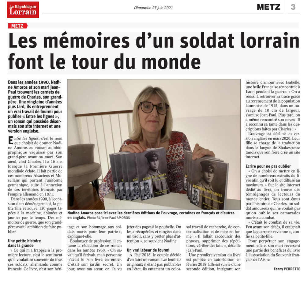 Début des années 1990, lors d’un déménagement, Nadine Amoros retrouve 130 pages tapées à la machine par son grand-père. De ces feuillets naît Entre les lignes, le roman autobiographique de Charles, Alsacien-Lorrain enrôlé dans l’armée allemande en 1917.